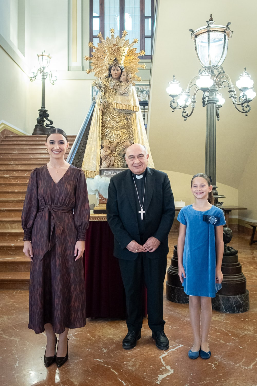 El Arzobispo de Valencia, Mons. Enrique Benavent, ha recibido hoy en audiencia, en el Palacio Arzobispal, a la Honorable Clavariesa Vicentina de 2026, Vicenta Evangelina Escudero García, así como a las Falleras Mayores de Valencia, Carmen Prades y Marta Mercader