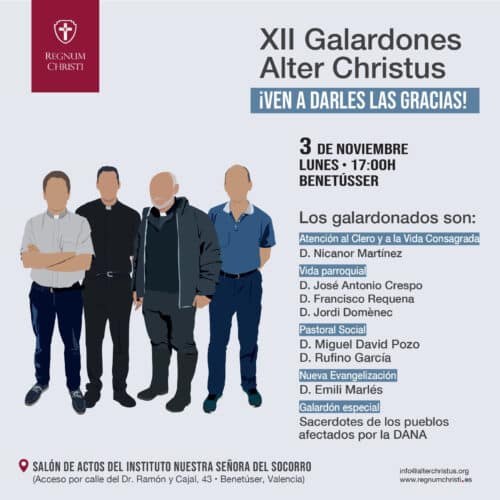 Más de sesenta sacerdotes de las localidades afectadas por la DANA recibirán el Galardón especial Alter Christus, concedido por el Regnum Christi, el lunes 3 de noviembre a las 17:00h, como reconocimiento a la entrega y acompañamiento a los afectados de la zona 0, «como signo de cercanía, consuelo y servicio en medio de la adversidad».