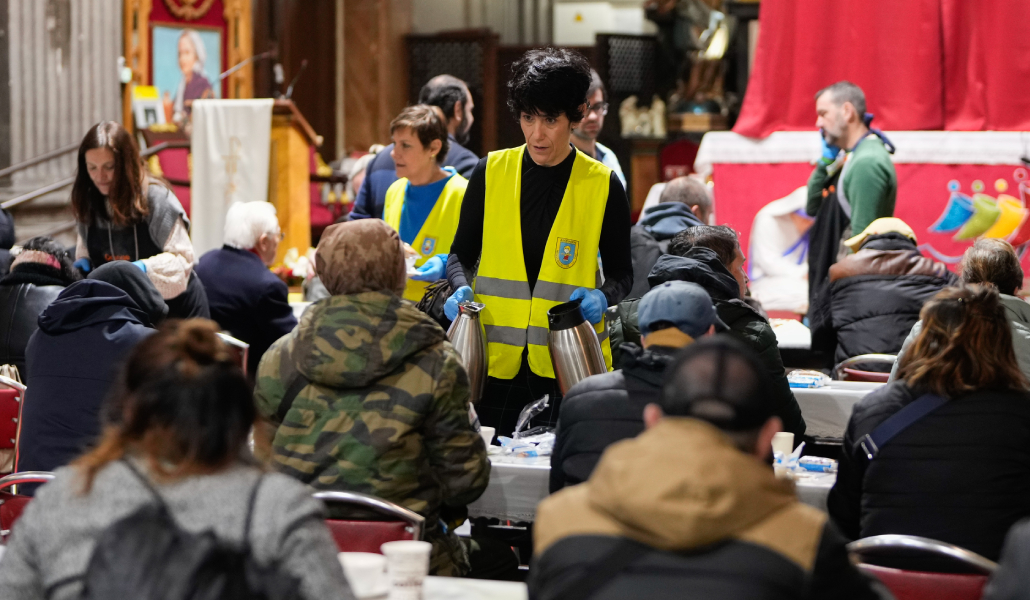 La ministra de Inclusión, Seguridad Social y Migraciones, Elma Saiz, se convirtió este viernes en voluntaria por un día al participar en el reparto solidario de desayunos que cada mañana organiza el padre Ángel y la asociación Mensajeros de la Paz en la iglesia de San Antón, en el barrio madrileño de Chueca.