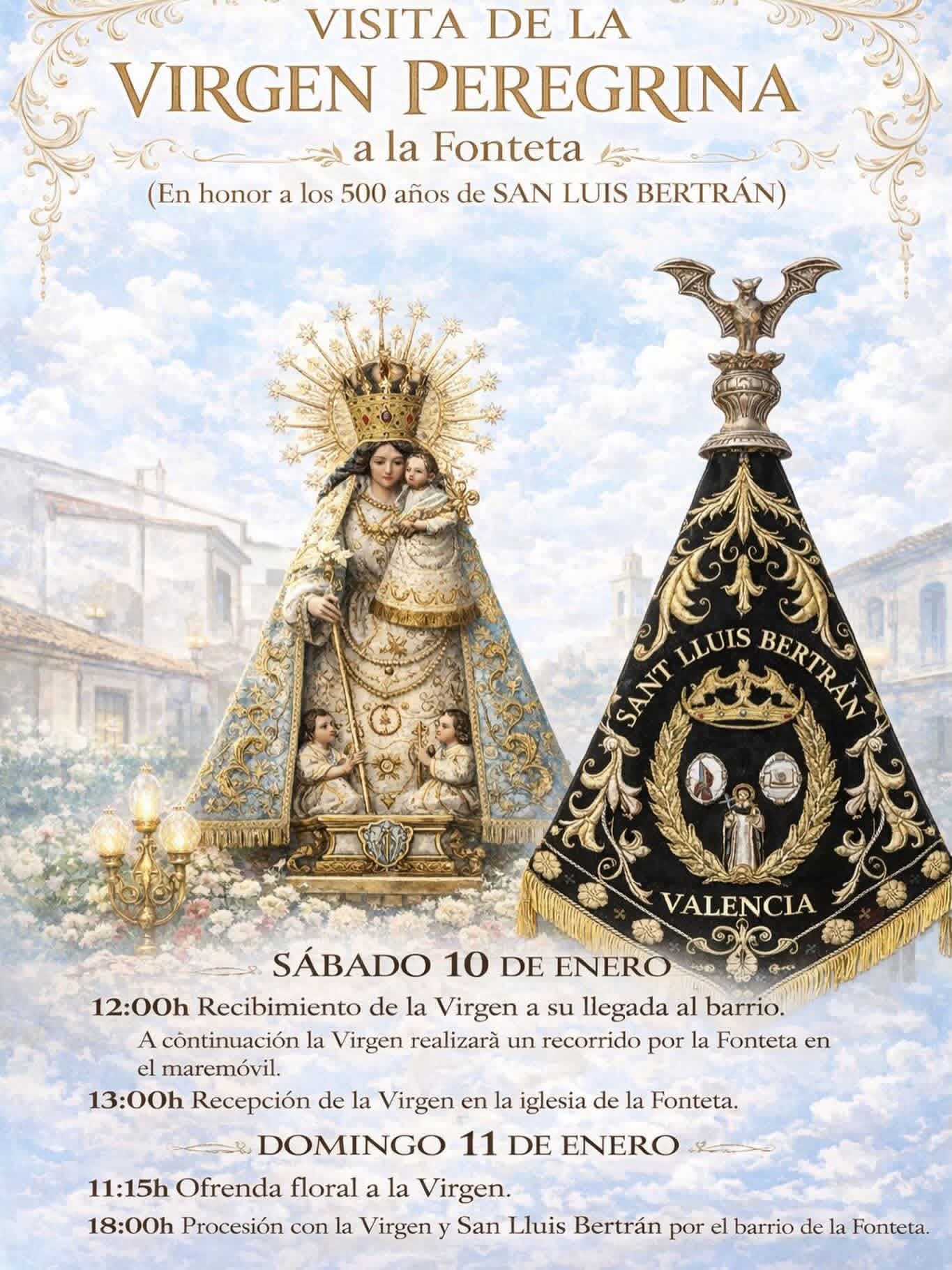 La imagen peregrina de la Virgen de los Desamparados realizará mañana, sábado, y durante el domingo, una visita al barrio valenciano de la Fonteta de San Luis, con motivo del 500 aniversario del nacimiento de San Luis Bertrán, santo valenciano, dominico y gran predicador.