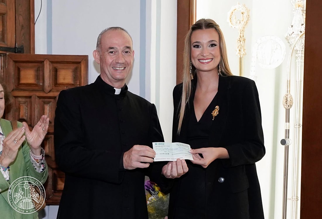 La Fallera Mayor de Valencia 2025, Berta Peiró, en representación de todas las Fallas de Valencia, hizo entrega de un cheque de la recaudación que se hizo durante los besamanos a la Virgen en la capilla de la Escolanía, en los que durante tres meses, de mayo a julio, cada fin de semana, todas las comisiones falleras acuden a este acto especial para todos los falleros y falleras, en los que los representantes de cada falla hacen ese besamanos a la Mare de Déu, un acto coordinado por la Hermandad de Seguidores de la Virgen de los Desamparados de Valencia.